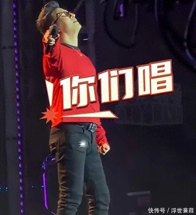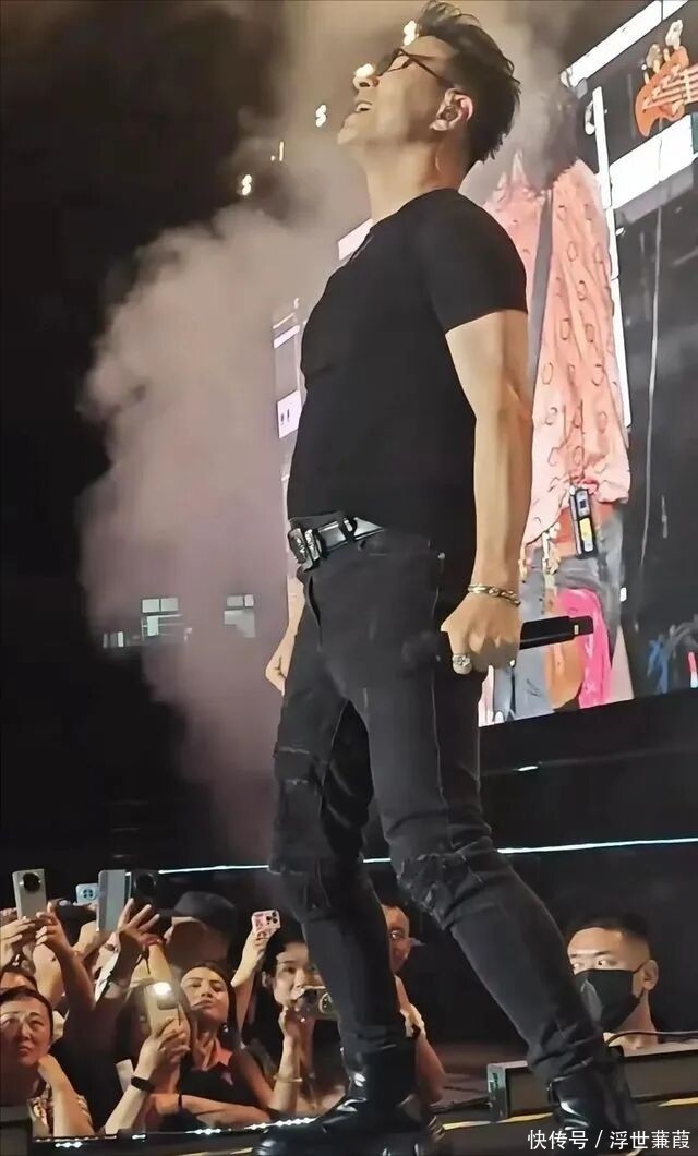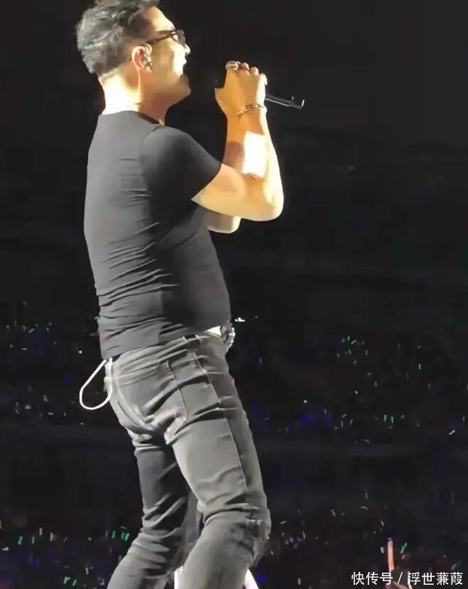 抬头一看,舞台上那位曾经意气风发的摇滚歌手,如今已是体态臃肿。即便穿着显瘦款的黑色T恤和深色牛仔裤,依旧遮不住明显的发福痕迹,早已不见昔日舞台上的精干模样。